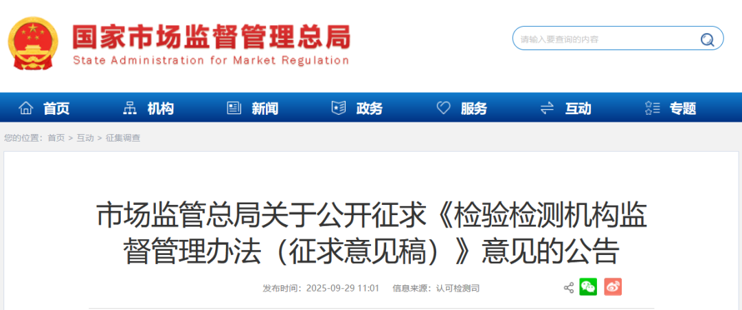为深入贯彻落实党中央、国务院决策部署,进一步强化检验检测行业管理,规范检验检测市场秩序,促进行业持续健康发展,市场监管总局启动《检验检测机构监督管理办法》修订工作,组织起草了《检验检测机构监督管理办法(征求意见稿)》,现向社会公开征求意见。公众可通过以下途径和方式提出意见: